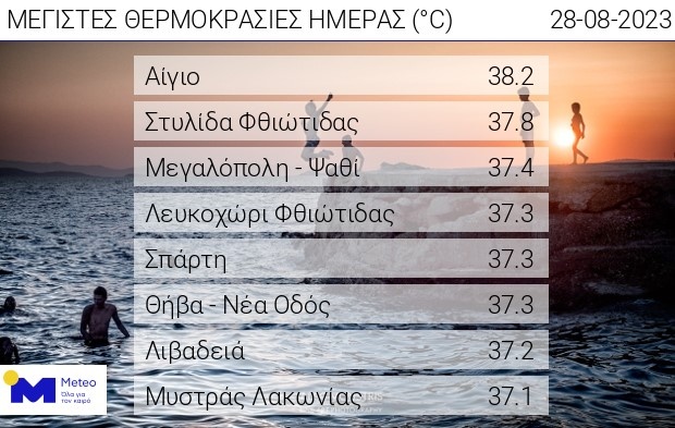 Στον ακόλουθο πίνακα παρουσιάζονται οι 8 σταθμοί που κατέγραψαν τις υψηλότερες μέγιστες θερμοκρασίες έως τις 17:00 το απόγευμα της Δευτέρας 28 Αυγούστου.