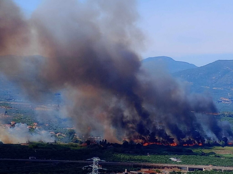Η πυρκαγιά στην Ασπροπουλιά Καλαμάτας καίει σε καλαμιώνες και χαμηλή βλάστηση.