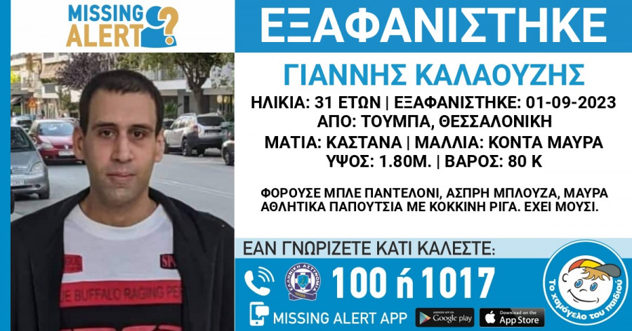 Στη 01/09/2023, πρωινές ώρες, εξαφανίστηκε από την περιοχή της Τούμπας Θεσσαλονίκης ο Καλαούζης Γιάννης, 31 ετών.