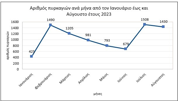 Ο μήνας με τις περισσότερες πυρκαγιές στην Ελλάδα είναι ο Ιούλιος με 1.508 πυρκαγιές και ακολουθούν ο Φεβρουάριος με 1.490 και ο Αύγουστος με 1.430 πυρκαγιές