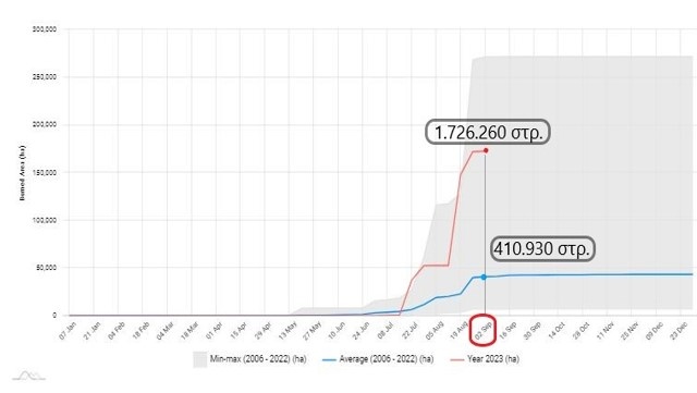 Στη συνέχεια οι καμένες εκτάσεις από την ως άνω ημερομηνία έως την 12.08.2023 αυξήθηκαν ελάχιστα δηλ. μόνον 870 στρ, όταν την 19.08.2023 εκτοξεύθηκαν σε 1.481.710 στρ ήτοι αύξηση κατά 945.020 στρ., 270,8%.