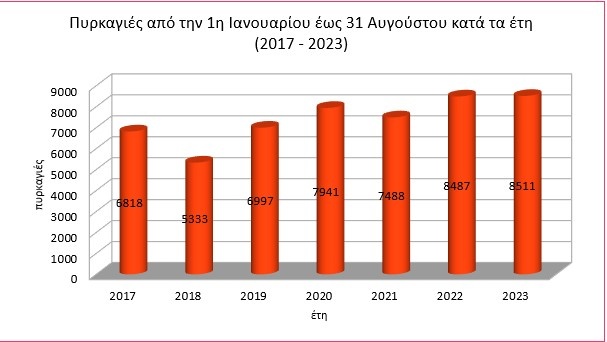 Παρήλθε το πρώτο τετράμηνο της τρέχουσας αντιπυρικής περιόδου 2023 και κρίνεται σκόπιμο να γίνει ένας απολογισμός για τις δασικές πυρκαγιές έως και την 02.09.2023. Αναλυτικότερα λοιπόν από την 1η Ιανουαρίου έως και την 31η Αυγούστου 2023 έλαβαν χώρα στην επικράτεια συνολικά 8.511 αγροτοδασικές πυρκαγιές, από τις οποίες αποτεφρώθηκαν στην επικράτεια συνολικά 1.726.260 στρέμματα αγροτοδασικών εκτάσεων.