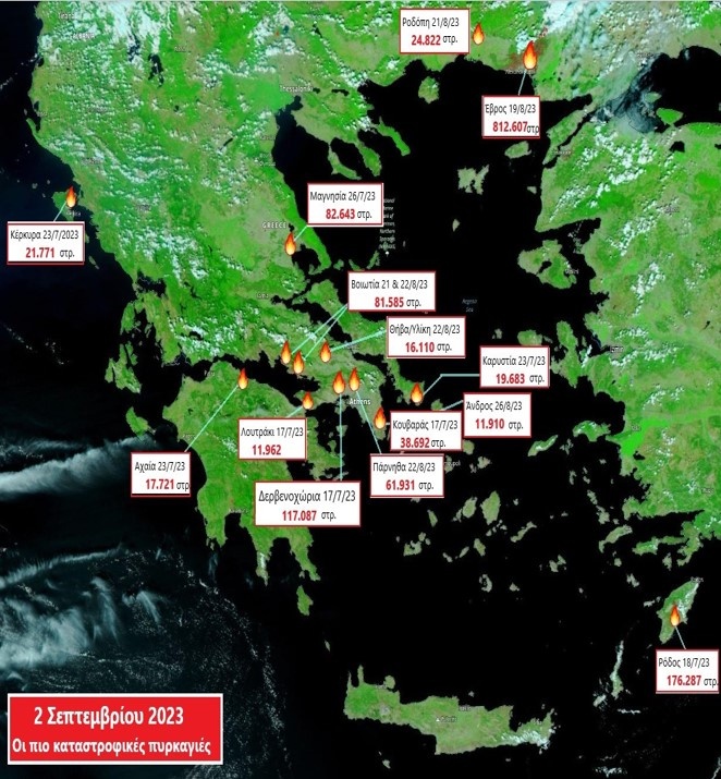 Ο αριθμός των μεγαλύτερων πυρκαγιών (>300 στρ.) οι οποίες ευθύνονται για τις συνολικά καμένες εκτάσεις των1.726.260 στρεμμάτων που καταγράφονται έως την 02.09.2023 είναι 47, ενώ ο μέσος ετήσιος αριθμός πυρκαγιών κατά τα έτη (2006 – 2022) είναι 44, αύξηση 6,8%