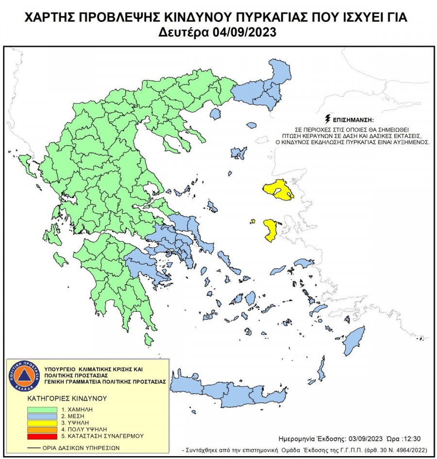 Σύμφωνα με το Χάρτη Πρόβλεψης Κινδύνου Πυρκαγιάς που εκδίδει η Γενική Γραμματεία Πολιτικής Προστασίας του Υπουργείου Κλιματικής Κρίσης & Πολιτικής Προστασίας (civilprotection.gov.gr), για αύριο Δευτέρα 4 Σεπτεμβρίου 2023, προβλέπεται υψηλός κίνδυνος πυρκαγιάς (κατηγορία κινδύνου 3) για τη Χίο και τη Μυτιλήνη.