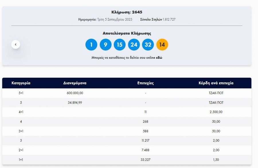 Πραγματοποιήθηκε σήμερα Τρίτη 5/9, η κλήρωση του Τζόκερ που μοιράζει τουλάχιστον 600.000 ευρώ στους νικητές της πρώτης κατηγορίας.