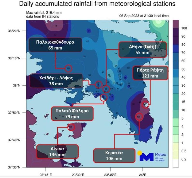 Σύμφωνα με το δίκτυο αυτόματων μετεωρολογικών σταθμών του Εθνικού Αστεροσκοπείου Αθηνών / meteo.gr το μεγαλύτερο ύψος βροχής από τα μεσάνυχτα (00:00) έως νωρίς το βράδυ (21:30) της Τετάρτης 06/09 σημειώθηκε στην Αίγινα με 136 mm, ενώ το ύψος βροχόπτωσης στην Αθήνα (Γκάζι) έφτασε τα 55 mm.