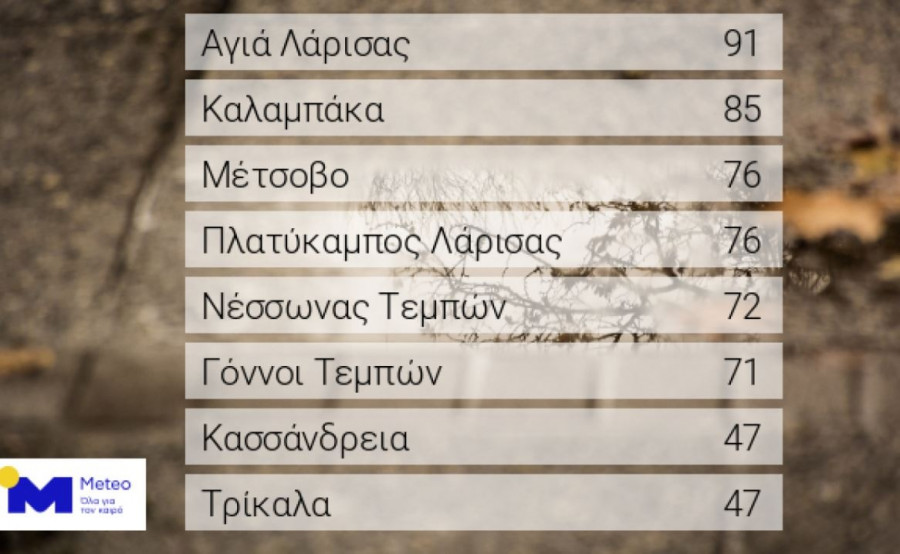 Σύμφωνα με το δίκτυο αυτόματων μετεωρολογικών σταθμών του Εθνικού Αστεροσκοπείου Αθηνών το μεγαλύτερο ύψος βροχής από τα μεσάνυχτα (00:00) έως τις 19:00 της Πέμπτης σημειώθηκε στην Αγιά, Λάρισας με 91 mm, ενώ τα οκτώ μεγαλύτερα ημερήσια ύψη βροχής παρουσιάζονται στον παρακάτω Πίνακα.