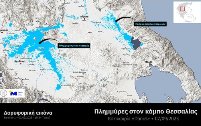 Ο χάρτης με τα δορυφορικά δεδομένα που επεξεργάστηκε το Εθνικό Αστεροσκοπείο Αθηνών/meteo.gr δείχνει με γαλάζιο χρώμα τις περιοχές της Θεσσαλίας που έχουν πλημμυρίσει από την κακοκαιρία Daniel