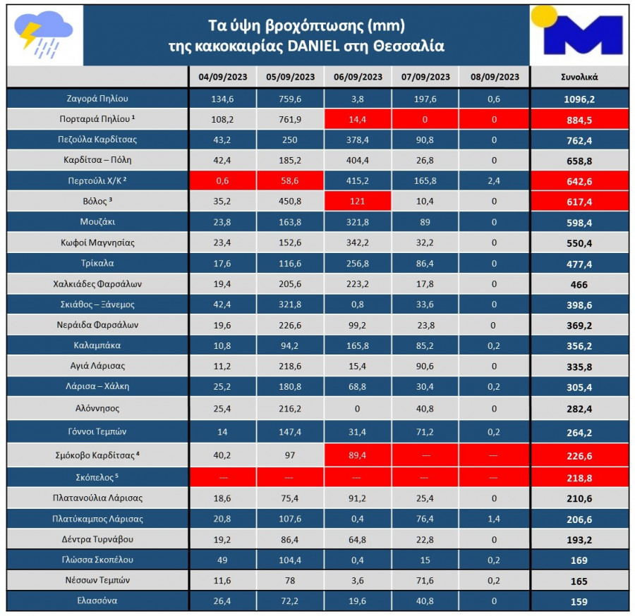 Για το Σμόκοβο Καρδίτσας εκκρεμεί η συλλογή δεδομένων στις 6-8 Σεπτεμβρίου, ενώ για τον σταθμό της Σκοπέλου εκκρεμεί η συλλογή των ημερήσιων τιμών της κακοκαιρίας, το άθροισμα ωστόσο είναι σωστό.