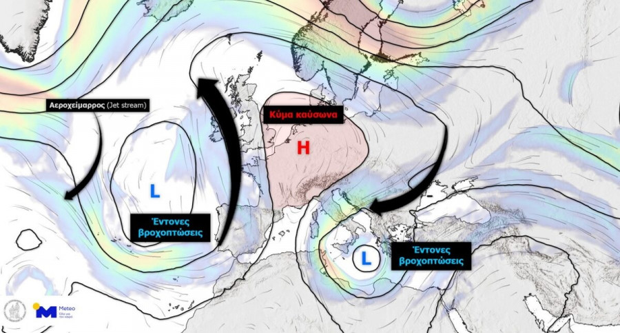 1. Στην αποκοπή ψυχρών αερίων μαζών από τη γενική κυκλοφορία της ατμόσφαιρας πάνω από την Ευρώπη, στην οποία οφείλεται το φαινόμενο της Ψυχρής Λίμνης. Η αργή νότια-νοτιοδυτική κίνηση της Ψυχρής Λίμνης οφείλεται στον έντονο κυματισμό του αεροχειμάρρου ο οποίος οδήγησε στην ανάπτυξη ενός εκτεταμένου πεδίου υψηλών πιέσεων πάνω από την Κεντρική και Βόρεια Ευρώπη (Ωμέγα εμποδιστή - Omega blocking). Οι Ωμέγα εμποδιστές όπως έχουμε αναφερθεί και σε παλαιότερα άρθρα μας συνδέονται με επίμονες καιρικές συνθήκες (Εικόνα 1) για αρκετές ημέρες αυξάνοντας έτσι την πιθανότητα εκδήλωσης ακραίου καιρού σε μια συγκεκριμένη γεωγραφική περιοχή.