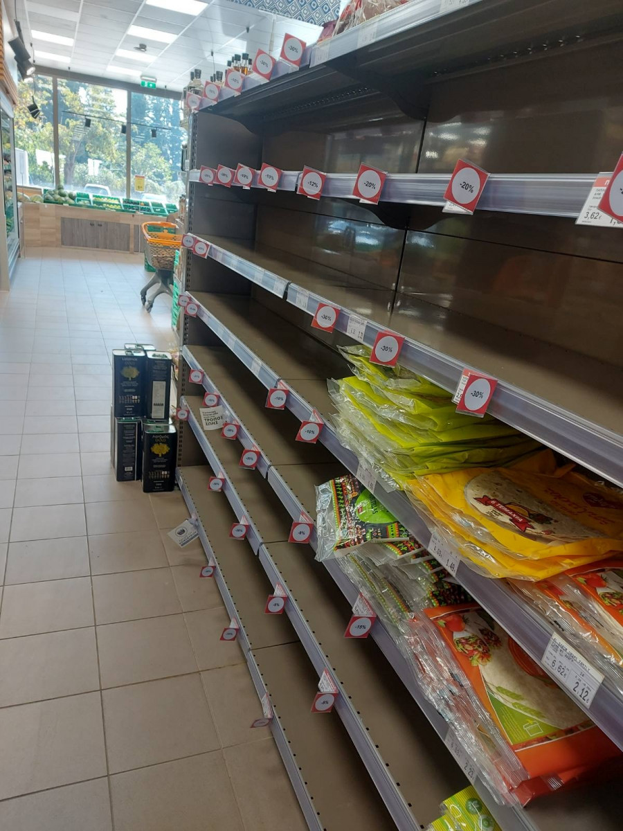 Η τροφοδοσία ουσιαστικά ανύπαρκτη. Τέταρτη μέρα σήμερα αποκλεισμού και τα ράφια στα σούπερ μάρκετ σχεδόν άδεια σε βασικά προϊόντα, διατροφικά και υγιεινής. Εμφιαλωμένο νερό δεν υπάρχει πουθενά, γαλακτοκομικά, όσπρια, μακαρόνια, αλεύρι, είδη όλα τους σε ανεπάρκεια.
