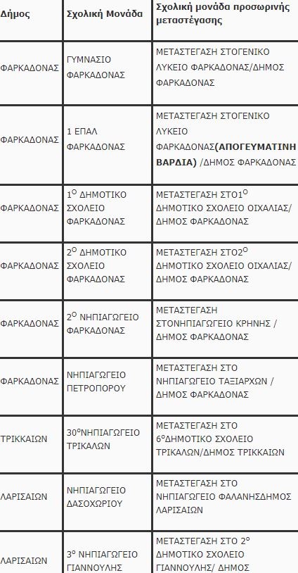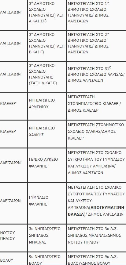 A. Θα μεταστεγαστούν προσωρινά σε κτίρια σχολικών μονάδων στον ίδιο ή σε όμορους δήμους και σε πρωινή βάρδια (εκτός δύο περιπτώσεων όπου ρητώς αναφέρεται απογευματινή βάρδια) οι παρακάτω σχολικές μονάδες ή τάξεις σχολικών μονάδων: