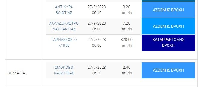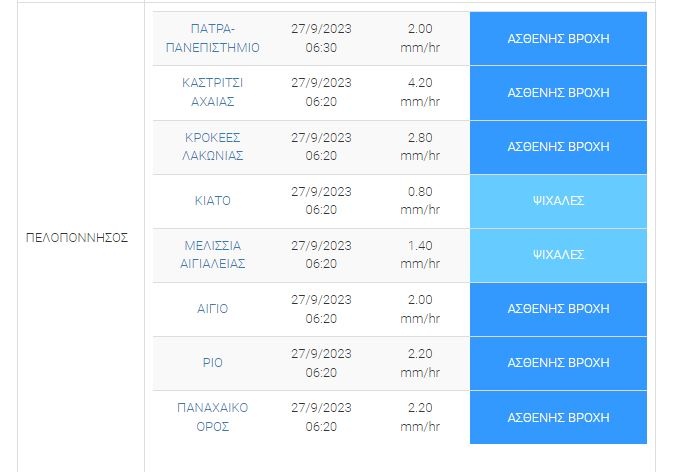 Βροχοπτώσεις καταγράφονται και στην Πελοπόννησο αλλά μικρότερης έντασης, ενώ ιδιαίτερα ισχυρή είναι η βροχή στην Αράχωβα, την Άμφισσα, τη Βατερή Εύβοιας και στα ψηλότρα υψόμετρα του Παρνασσού.