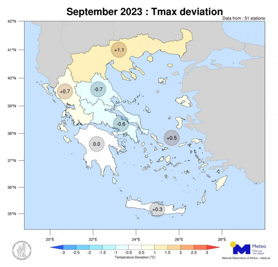 Στην Αθήνα, η μέση μηνιαία τιμή απόκλισης της μέγιστης θερμοκρασίας ήταν -0,5 °C, με 18 από τις 30 ημέρες του μήνα να είναι ψυχρότερες από τα κανονικά για την εποχή επίπεδα. Στη Θεσσαλονίκη, 19 ημέρες του μήνα ήταν θερμότερες από τη μέση τιμή της περιόδου 2010-2019, όπου η μέση μέγιστη θερμοκρασία του μήνα κυμάνθηκε 0,7ºC πάνω από τα κανονικά επίπεδα. Στο Δράμα και το Κιλκίς παρατηρήθηκαν οι περισσότερες ημέρες με θετική απόκλιση θερμοκρασίας (24 ημέρες) και ακολουθούν η Ξάνθη και η Αλεξανδρούπολη με 23 ημέρες.