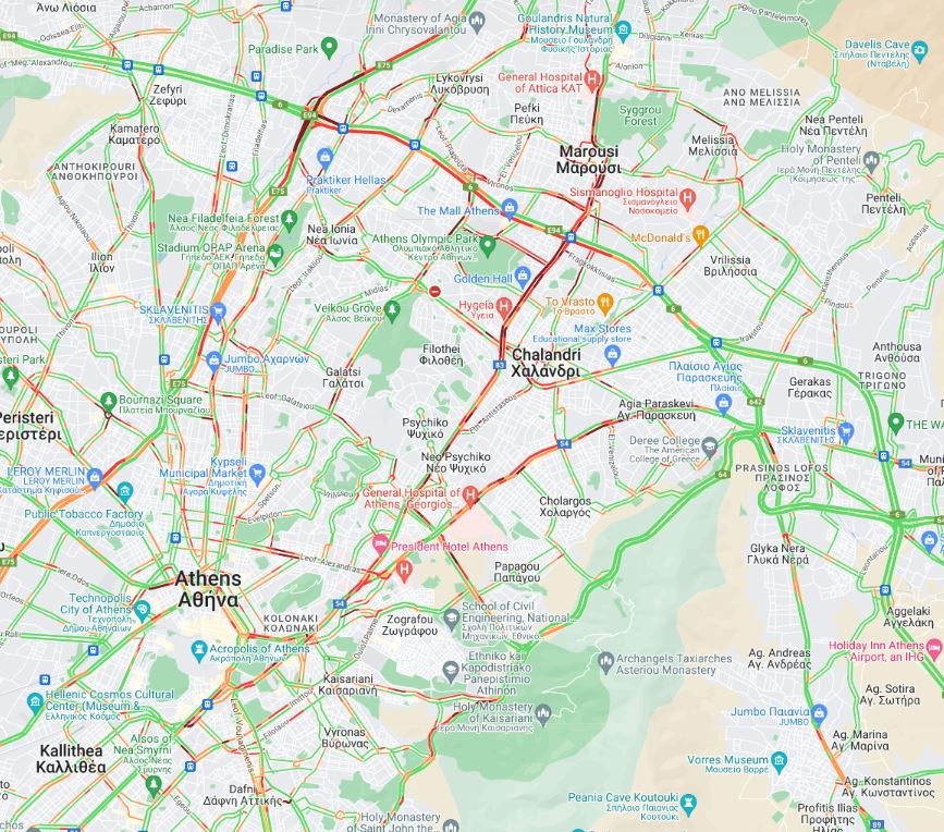 Η κίνηση εμφανίζεται στους χάρτες κυκλοφορίας στο «κόκκινο» επηρεάζοντας και τους γύρω δρόμους.