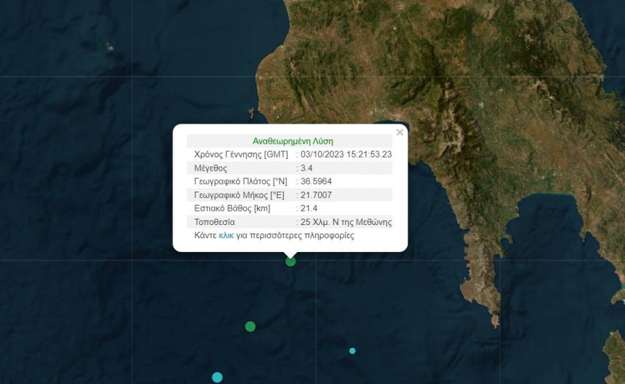 Δεύτερος αισθητός σεισμός στη Μεθώνη μέσα σε λίγες ώρες. 3,4 Ρίχτερ ταρακούνησαν την περιοχή και ακολούθησαν τα 3,7 Ρίχτερ που σημειώθηκαν το πρωί της Τρίτης 3 Οκτωβρίου