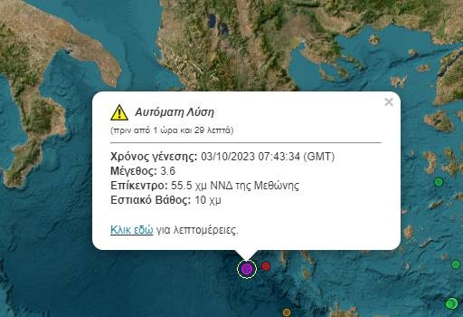 Σεισμική δόνηση 3,7 Ρίχτερ σημειώθηκε και το πρωί της Τρίτης στις 10:43 π.μ. στο θαλάσσιο χώρο νοτίως της Μεθώνης.
