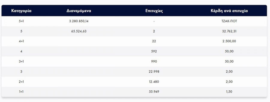 Αξίζει να σημειωθεί ότι στην δεύτερη κατηγορία (5αρια) βρέθηκαν δύο επιτυχημένα δελτία που κερδίζουν από 32.762,31 ευρώ το κάθε ένα!