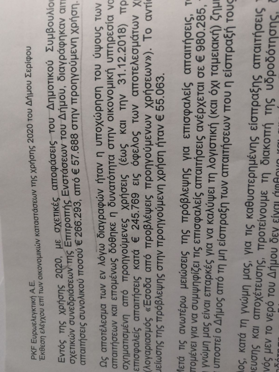 Οι εκθέσεις των Ορκωτών λογιστών είναι σαφείς και απόλυτες. Έχουν διαγραφεί απαιτήσεις του Δήμου Σερίφου από ιδιώτες ύψους 860.000 Ευρώ!