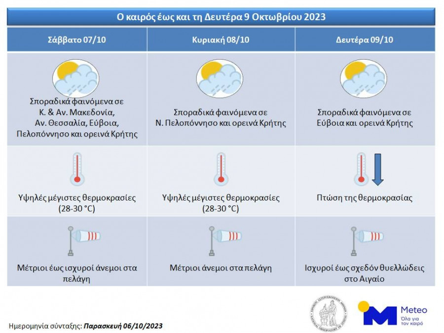 - το Σάββατο 07/10 στην Κεντρική και Ανατολική Μακεδονία, στην Ανατολική Θεσσαλία, στην Εύβοια, στην Πελοπόννησο και στα ορεινά της Κρήτης