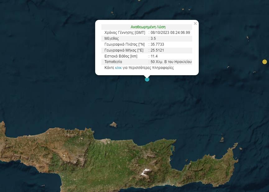 Σύμφωνα με την Αναθεωρημένη Λύση του Γεωδυναμικού Ινστιτούτου, ο σεισμός ήταν μεγέθους 3,5 Ρίχτερ και σημειώθηκε 50 χιλιόμετρα βόρεια του Ηρακλείου. Το εστιακό βάθος υπολογίζεται στα 11,4 χιλιόμετρα.