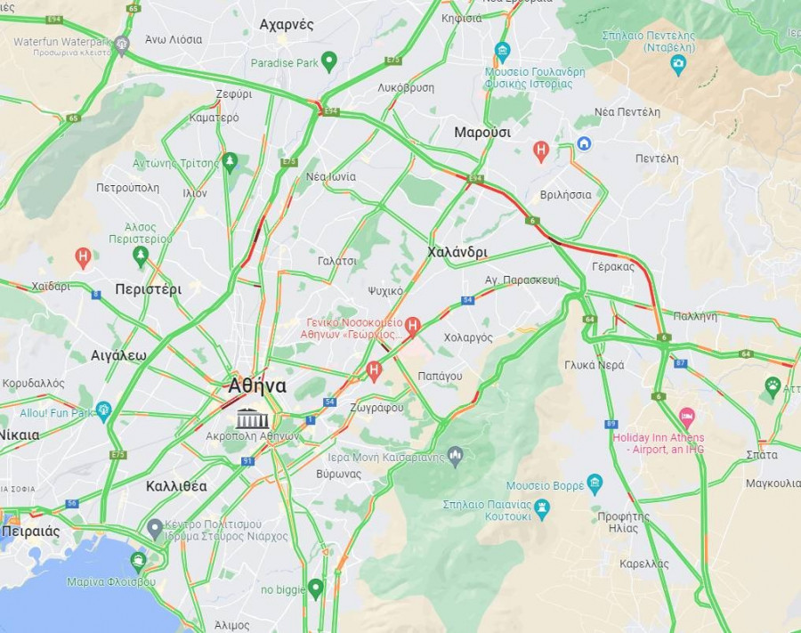 Στο «κόκκινο» είναι αυτή την ώρα και οι δρόμοι γύρω από το κέντρο της Αθήνας, ενώ και στην Πειραιώς η κυκλοφορία των οχημάτων πραγματοποιείται με δυσκολία. Κίνηση παρατηρείται και στο ρεύμα ανόδου του Κηφισού.