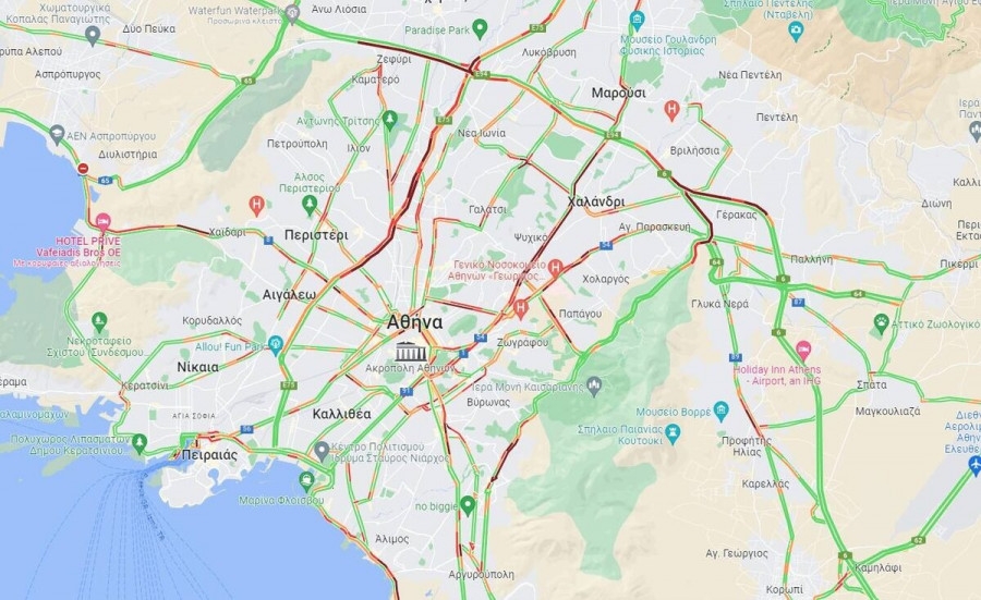 Με χαμηλές ταχύτητες κινούνται τα οχήματα επί της Μεσογείων, της Κηφισίας, της Λ. Αλεξάνδρας αλλά και στην περιφερειακή Αιγάλεω.