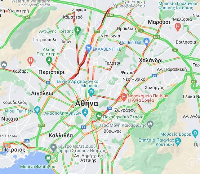 Μποτιλιάρισμα παρατηρείται αυτή την ώρα και στη Λεωφόρο Κηφισίας, τη Μεσογείων και τους δρόμους γύρω από το κέντρο της Αθήνας.