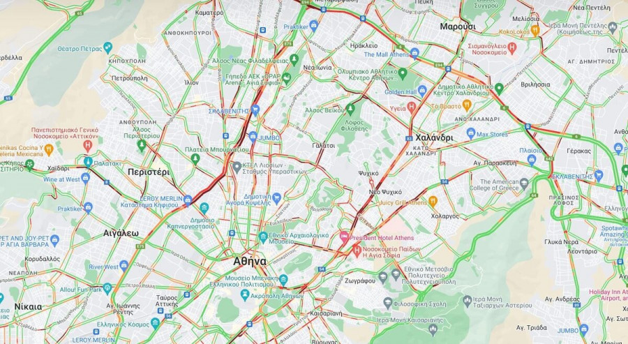 Παράλληλα χαμηλές ταχύτητες και στη λεωφόρο Αθηνών-Λαμίας από την Αθηνών έως τον κόμβο Καλυφτάκη αλλά και στην Αθηνών-Κορίνθου/Λ. Αθηνών (έξοδος).