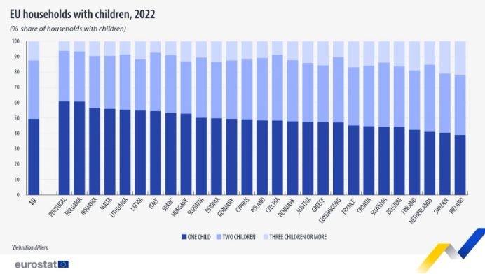 Το 2022 στην Ευρωπαϊκή Ένωση υπήρχαν σχεδόν 200 εκατομμύρια νοικοκυριά, όπου το ένα τέταρτο αυτών (24,3%) είχε παιδιά. Περίπου το 10% των νοικοκυριών είχε είτε 1 παιδί (12,1%) είτε 2 παιδιά (9,3%), ενώ μόνο το 3,0% των νοικοκυριών της ΕΕ είχε 3 παιδιά ή περισσότερα.
