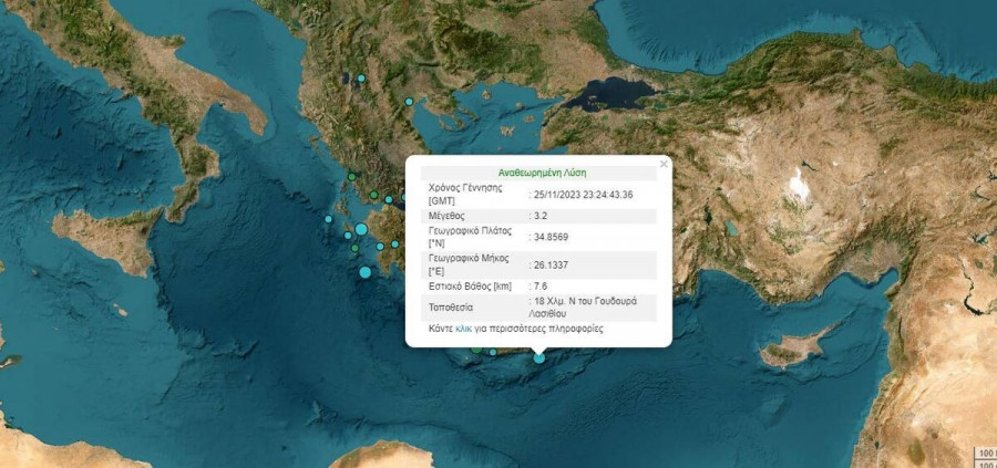 Ο σεισμός καταγράφηκε 18 χιλιόμετρα νότια του Γουδουρά Λασιθίου, ενώ σύμφωνα με το Γεωδυναμικό Ινστιτούτο Αθηνών, το εστιακό του βάθος υπολογίζεται στα 7,6 χιλιόμετρα.