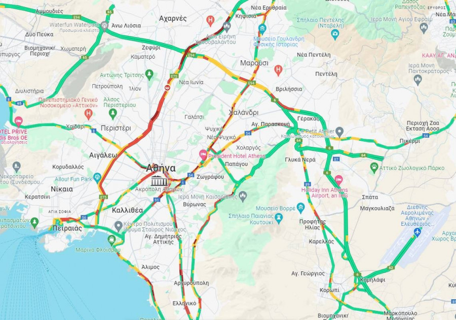 Συγκεκριμένα, στο «κόκκινο» είναι ο Κηφισός και στα δύο ρεύματα. Στην κάθοδο προς Πειραιά η κίνηση ξεκινά από το ύψος της Λυκόβρυσης έως και το ύψος του Αιγάλεω. Αντίστοιχα η κίνηση στο ρεύμα προς Λαμία ξεκινά από το ύψος της Καλλιθέας και φτάνει μέχρι και το ύψος της Νέας Φιλαδέλφειας.