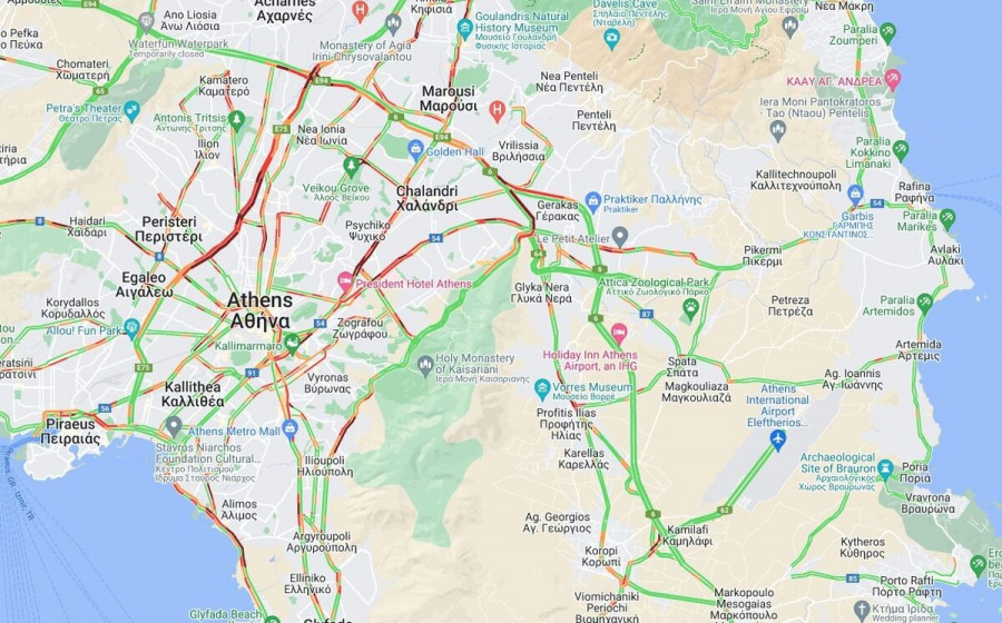 Καθυστερήσεις υπάρχουν και στους δρόμους γύρω από το λιμάνι του Πειραιά, στην Παραλιακή και φυσικά σε Κηφισίας και Μεσογείων.