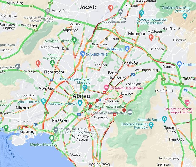 Στο κόκκινο είναι αυτή την ώρα η Κηφισίας, η Μεσογείων, η Πανόρμου αλλά και τμήματα της Αττικής Οδού, η οποία κλείνει.