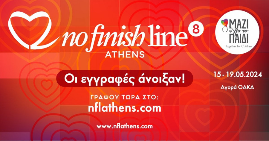Για 8η συνεχόμενη χρονιά το No Finish Line Athens παίρνει θέση εκκίνησης και περιμένει μικρούς και μεγάλους ανεξαρτήτου ηλικίας και φυσικής κατάστασης, να ανταποκριθούν στο κάλεσμα για συμμετοχή στον κορυφαίο φιλανθρωπικό αγώνα της Ελλάδας που γίνεται αποκλειστικά για την ενίσχυση του «Μαζί για το Παιδί».