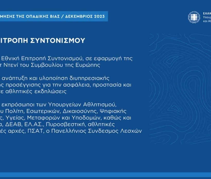 • Συμμετέχουν εκπρόσωποι των Υπουργείων Αθλητισμού, Προστασίας του Πολίτη, Εσωτερικών, Δικαιοσύνης, Ψηφιακής Διακυβέρνησης, Υγείας, Υποδομών και Μεταφορών, καθώς και από Εισαγγελία, ΔΕΑΒ, ΕΛ.ΑΣ., Πυροσβεστική, αθλητικές και ποδοσφαιρικές Αρχές, ΠΣΑΤ, ο Πανελλήνιος Σύνδεσμος Λεσχών Φιλάθλων κ.ά.