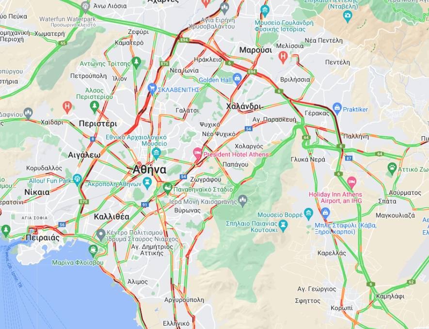 Στο κόκκινο και οι δρόμοι στον Πειραιά και στο κέντρο της Αθήνας, ενώ μεγάλες καθυστερήσεις σημειώνονται τόσο στη Λεωφόρο Ποσειδώνος όσο και στη Λεωφ. Κηφισίας.