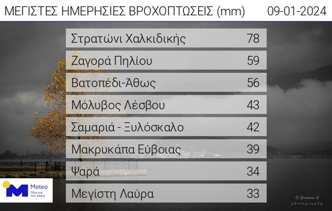 Σύμφωνα με το δίκτυο αυτόματων μετεωρολογικών σταθμών του Εθνικού Αστεροσκοπείου Αθηνών / meteo.gr έως τις μεσημεριανές ώρες της Τρίτης 09/01, η υψηλότερη μέγιστη ριπή ανέμου σημειώθηκε στoν Ξάνεμο Σκιάθου με 100 km/h, ενώ το μεγαλύτερο ύψος βροχής στο στo Στρατώνι Χαλκιδικής με 78 mm.