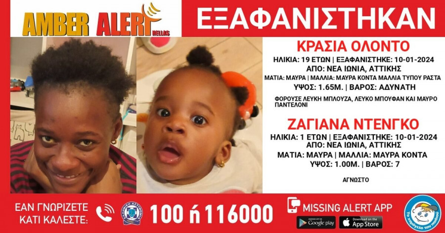 Στις 10/01/2024, και ώρα 08.00, εξαφανίστηκαν από τη Νέα Ιωνία Αττικής, η Κράσια (ον) Ολόντο (επ), 19 ετών μαζί με το μωρό της, Ζαγιάνα (ον) Ντένγκο (επ), με καταγωγή από το Κονγκό.