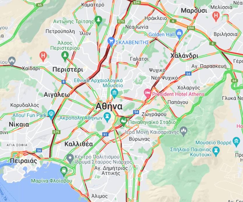 Μποτιλιάρισμα υπάρχει και στη Λεωφόρο Κηφισίας και στα δύο ρεύματα ενώ κίνηση βλέπουμε και στη Λεωφόρο Ποσειδώνος, τον Πειραιά και το κέντρο της Αθήνας.