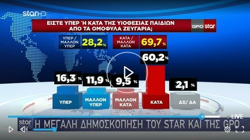 Σύμφωνα με τη δημοσκόπηση η πλειοψηφία της κοινής γνώμης είναι κατά της τεκνοθεσίας από ομόφυλα ζευγάρια. Συγκεκριμένα το 69,7% τάσσεται κατά ενώ μόνο το 28,2% συμφωνεί με το νέο νομοσχέδιο που θέλει να φέρει η κυβέρνηση.