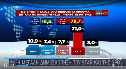 Μάλιστα η πλειοψηφία των ερωτηθέντων το 78,7% τάσσεται κατά στο να μπορούν τα ομόφυλα ζευγάρια να υιοθετούν μέσω παρένθετης μητέρας.