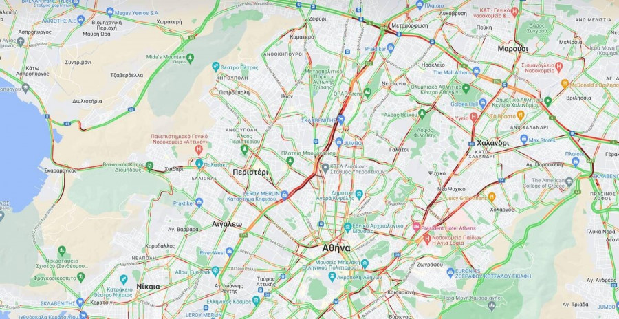 Παράλληλα, αργές ταχύτητες εντοπίζονται στα δύο ρεύματα του Κηφισού, στην Αττική Οδό, στο κέντρο της Αθήνας, στην Παραλιακή αλλά και στη Λεωφόρο Αθηνών στο ρεύμα προς Ασπρόπυργο.