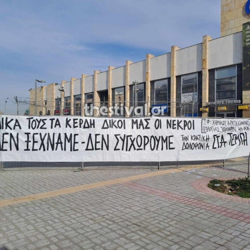 Οι φοιτητές κατά τη διάρκεια της διαμαρτυρίας τους σήκωσαν πανό που έγραφε: «Δικά τους τα κέρδη, δικοί μας οι νεκροί. Δεν ξεχνάμε- Δεν συγχωρούμε την κρατική δολοφονία στα Τέμπη».