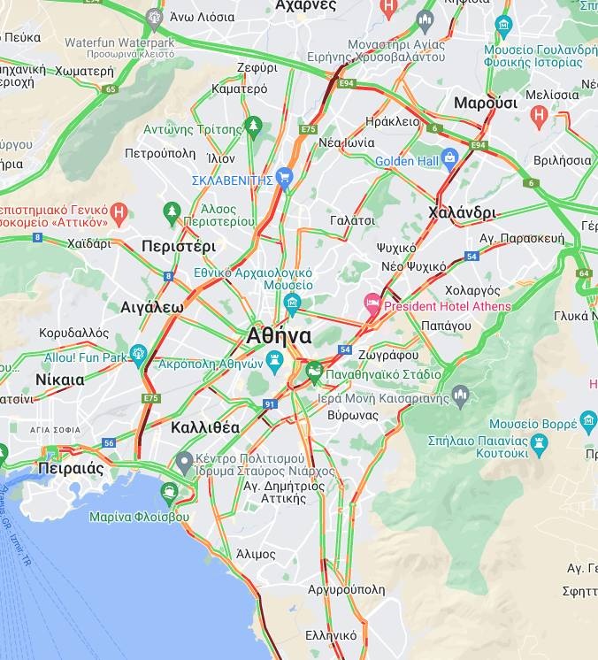 Στο κόκκινο είναι και οι δρόμοι γύρω από το κέντρο της Αθήνας ενώ «ουρές» χιλιομέτρων σημειώνονται και στη Λεωφόρο Ποσειδώνος στο ρεύμα προς Καλλιθέα.