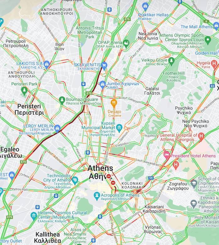 Παράλληλα, στο «κόκκινο» είναι και οι δρόμοι γύρω από το κέντρο της Αθήνας.