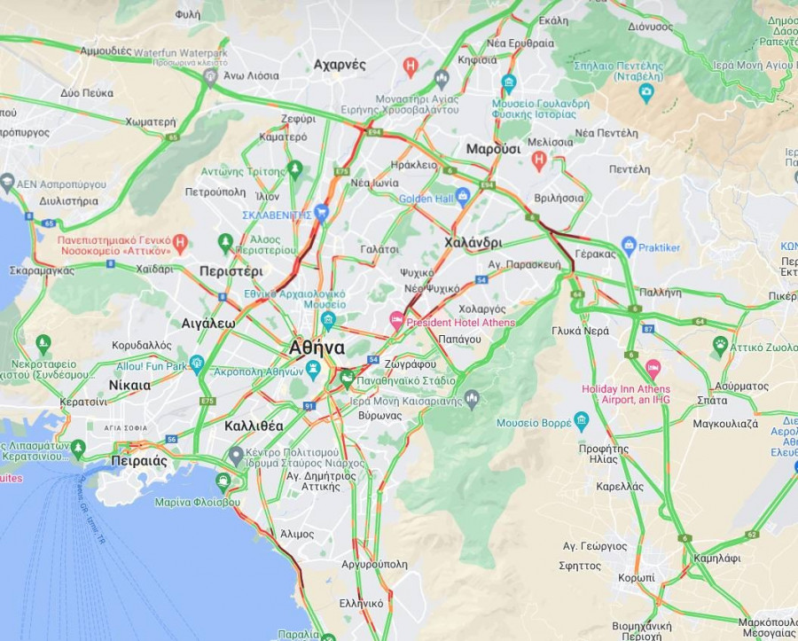 Συγκεκριμένα, μεγάλες καθυστερήσεις παρατηρούνται και στα δύο ρεύματα της Λεωφόρου Κηφισού, όπως επίσης και στη Λεωφόρο Κηφισίας, τη Λεωφόρο Αθηνών (στο ύψος του Σκαραμαγκά), τη Μεσογείων, την Κατεχάκη, την Παραλιακή αλλά και την Αττική Οδό.