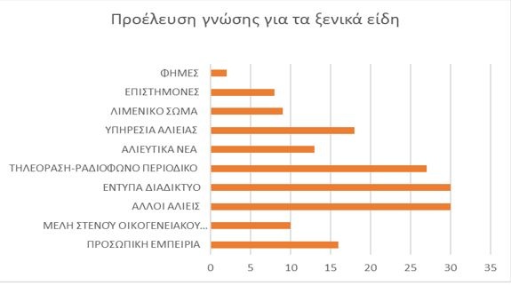 Η εικόνα δείχνει ότι περισσότεροι αλιείς έχουν μάθει για τα ξενικά είδη από άλλους αλιείς και το διαδίκτυο. Δευτερευόντως από την τηλεόραση, ραδιόφωνο και περιοδικά. Σε μικρότερο ποσοστό από υπηρεσίες αλιείας, και προσωπική εμπειρία και τέλος από τον περιοδικό τύπο, μέλη του στενού οικογενειακού κύκλου, το λιμενικό σώμα, επιστήμονες και φήμες.