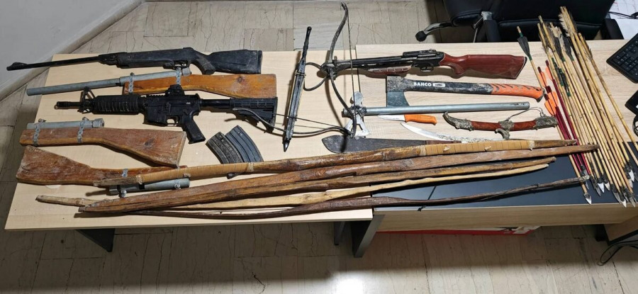 Ακολούθησε έρευνα της αστυνομίας, όπου εντοπίστηκε ποσότητα από όπλα και σφαίρες, καθώς και αυτοσχέδια τόξα και βέλη.