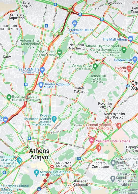 Πιο συγκεκριμένα, στο «βαθύ κόκκινο» είναι η άνοδος του Κηφισού από το ύψος του Περιστερίου και η κάθοδος από το ύψος της Νέας Ιωνίας έως την Λυκόβρυση. Παράλληλα κυκλοφοριακά προβλήματα υπάρχουν και σε τμήματα της Λεωφόρου Κηφισίας τόσο στην άνοδο όσο και στην κάθοδο όπως και στην Αττική Οδό από το ύψος των Αχαρνών έως και το Μαρούσι.